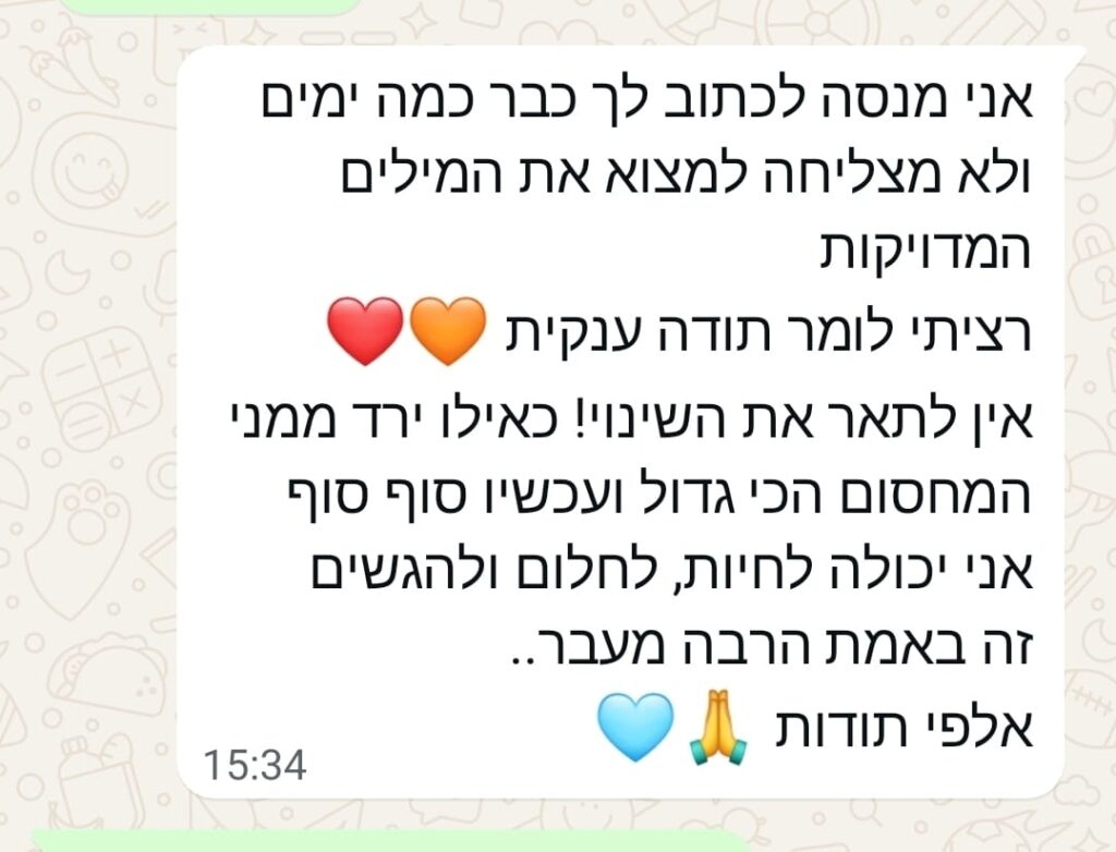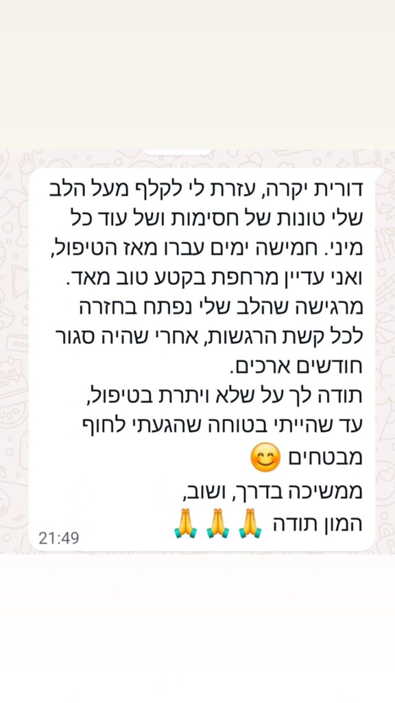 לכן, בשיטה שבה אני מטפלת כבר מהשלב הראשון אני מחזירה את הכוח אלייך, מלמדת אותך לטפל בעצמך.